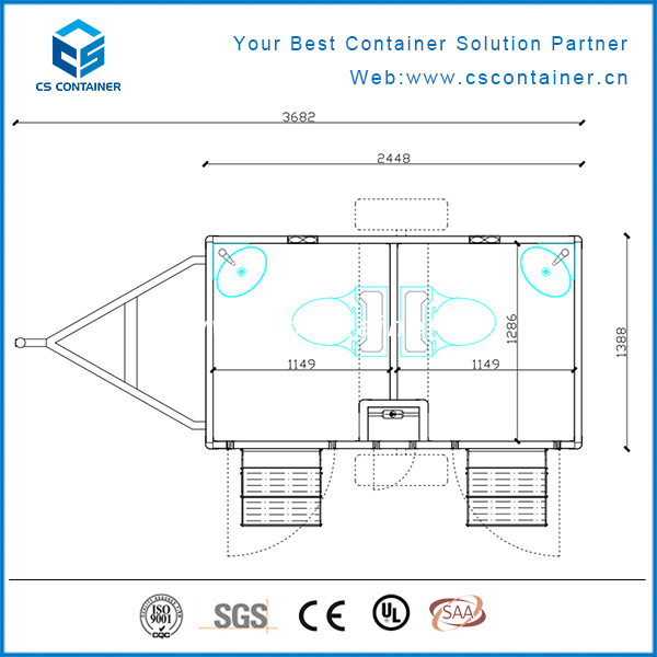 Be made of fiberglass + steel frame + polyurethane foam insulation,300L water tank ,300L waste tank,with 2 toilets,2 washbasins,plumbings,exhaust fans,with trailer,etc.